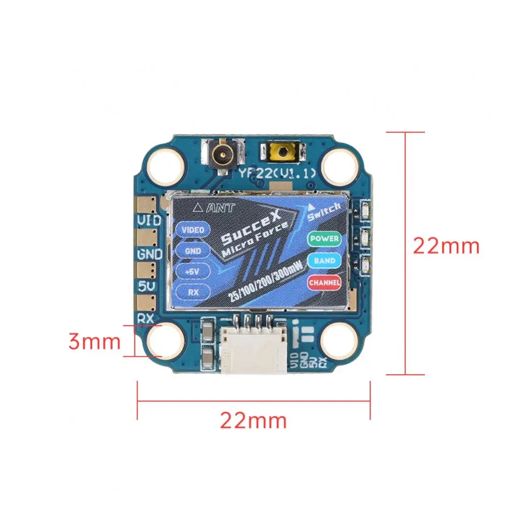 Small size but big power! The iFlight Micro Force is the VTX you need for your next Micro build. Small enough to fit into smallest frames, but enough power to get some signal through some of those dense trees. Switchable from 25mW up to 300mW with excellent Power output stability. PIT mode also allows you to power up your quad with pilots nearby without stomping on their frequency.