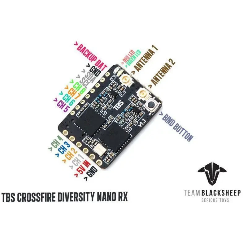 The TBS CROSSFIRE Diversity Nano Receiver is a compact R/C receiver with 8ch outputs (PPM, SBUS, and CRSF capable), with best-in-industry noise-rejection and record-breaking range capability. It is the only receiver to provide a true dual-input stage, chip-based diversity, with the usual filtering and noise rejection from on board video systems.